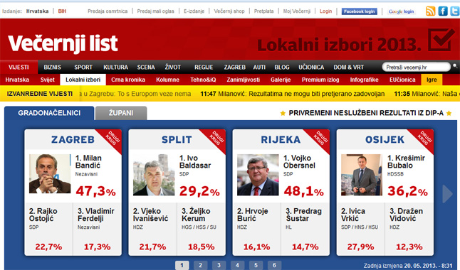 Ami a nagyvárosokat illeti a főváros, Split, Rijeka, Eszék, Varasd, Karlovac, Krapina, Šibenik, Dubrovnik, Bjelovar, Koprivnica, Zadar, Vukovar, Sisak, Slavon Bród, Pazin, Gospić, Požega és Pula is majd csak a második körben kap új polgármestert. Čakovecnek a SDP-HNS-HSU-MDS-HSS koalíció által jelölt polgármesterjelölt nyert, míg Viroviticának és Velika Goricanak HDZ-s polgármestere lesz a következő időszakban.