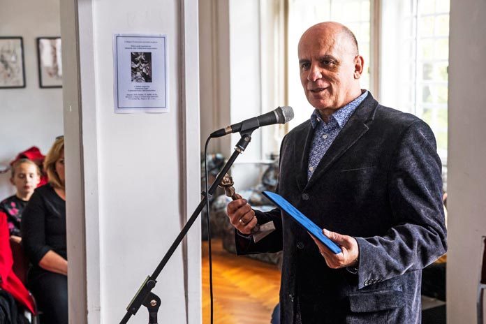 Budapest, 2018. október 23. Az Arany János-díjjal elismert Kontra Ferenc író beszél a Magyar Írószövetség Bajza utcai székházában 2018. október 23-án, az 1956-os forradalom és szabadságharc kitörésének 62. évfordulóján rendezett ünnepi megemlékezésen. MTI/Mónus Márton