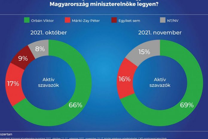 Azt írták, hogy az október 11-12. és november 15-17. között, 1000-1000 ember telefonos megkérdezésével készült kutatásból kiderült, „a kormányfővel szemben induló, baloldali pártok támogatását élvező, a rezsicsökkentést korábban ostobaságnak nevező Márki-Zay Péter” győzelmi esélyei csökkentek: 17-ről 16 százalékra. Mindez szerintük azt igazolja, hogy Márki-Zay Péter nem tudta a kormánnyal kritikus tábor méretét növelni.