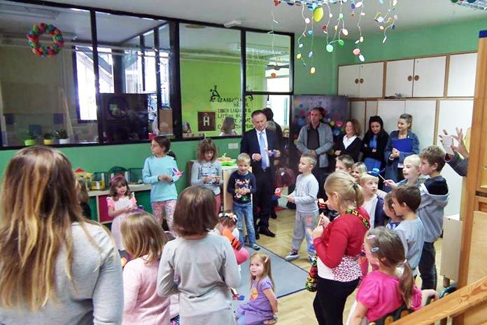 A vendégeket az óvoda igazgatója, Borka Rumiha asszony fogadta, és beszámolt arról is, hogy a magyar kormány Kárpát-medencei óvodafejlesztési programjának köszönhetően javítani tudtak a magyar óvodai részleg munkakörülményein, többek között a parkettet újították föl a támogatásból.
