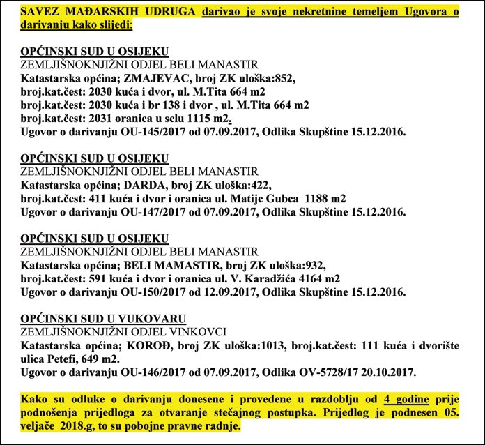E mellett az eszéki cégbíróság bírónője egy, a jogban szokatlan „érdekes” kifejezést használva kitér a MESZ részéről időközben odaajándékozott négy ingatlanra, amelyek ügyében úgymond javasolja az adományozási szerződések semmissé tételi folyamatának az elindítását (horvátul: pobojnost). Amennyiben ez az eljárás is elindul, párhuzamosan fog menni a jelenleg vitathatatlan tulajdonú ingatlanok értékesítésével.