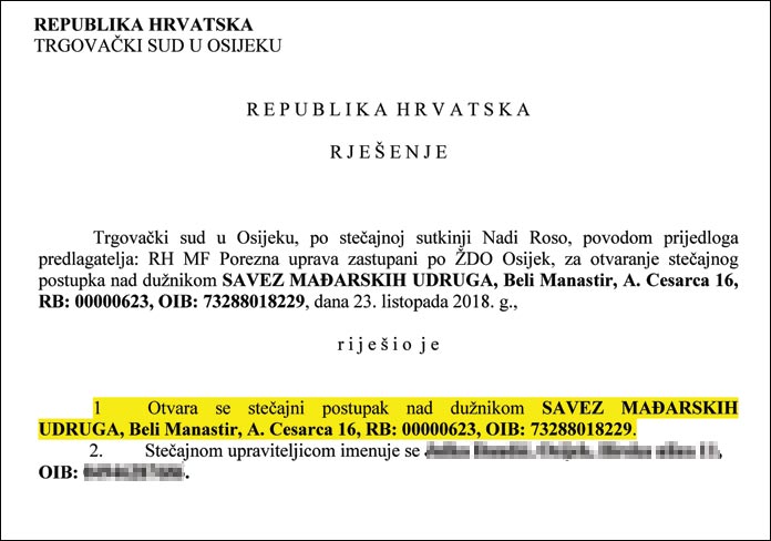 Szerkesztőségünk birtokába jutott az eszéki cégbíróság végzése, amelyben többek között rögzítik azt is, hogy a MESZ megnevezése mostantól „MESZ csődeljárás alatt”, ez a közigazgatási hivatalban való nyilvántartásra is vonatkozik. A továbbiakban felsorolják a MESZ tulajdonában lévő ingóságokat és ingatlan vagyont, amely része lesz a csődeljárás alatti értékesítésnek. Így például két személygépkocsit és öt (5) ingatlant, köztük a haraszti, ójankováci, sepsei és brekinskai MESZ-házakat is, valamint elrendeli az illetékes bíróságoknak, hogy a MESZ vagyonára a telekkönyvekben jegyezzék be, hogy ezek „csődeljárás alatt” állnak.