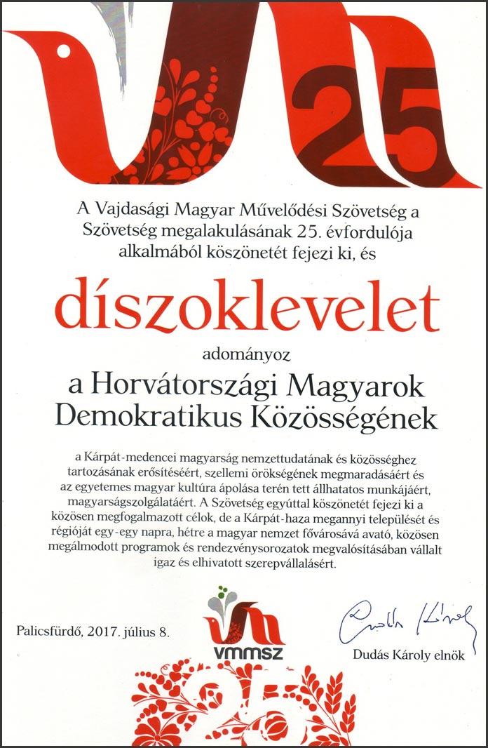 Oklevelet kapott a Horvátországi Magyarok Demokratikus Közössége is.