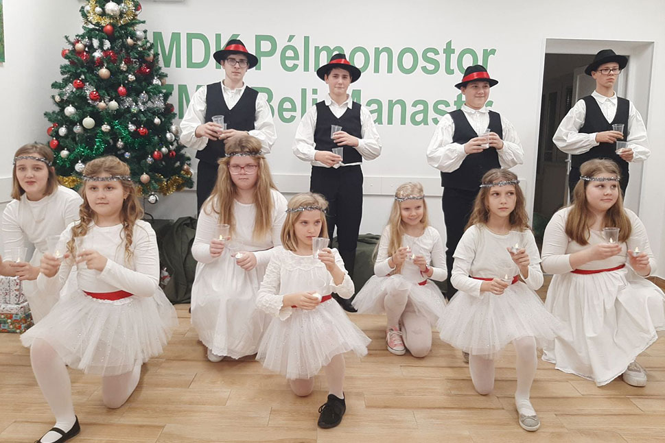 A HMDK pélmonostori alapszervezete keretében működő gyermektánccsoport két szekciója, a Csillagszemű, valamint a Csillagocskák nevet viselő együttesek december 19-én tartották meg évzáró műsorukat. Kovács Ferenctől, az egyesület elnökétől megtudtuk, a gyerekek új koreográfiával is készültek a karácsonyi előadásra, és noha nem teljes létszámban, de gyönyörű műsort mutattak be a közönségnek.