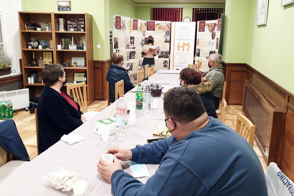 A járványhelyzet miatt szűkebb keretek között megtartott roll-up kiállításra a sepsei HMDK-alapszervezet otthonában került sor, mivel a hercegszőlősi egyesületnek jelenleg nincs székhelye. A programot Kettős Lívia, a szőlősi egyesület vezetője nyitotta meg a kiállítás témájának rövid ismertetésével.