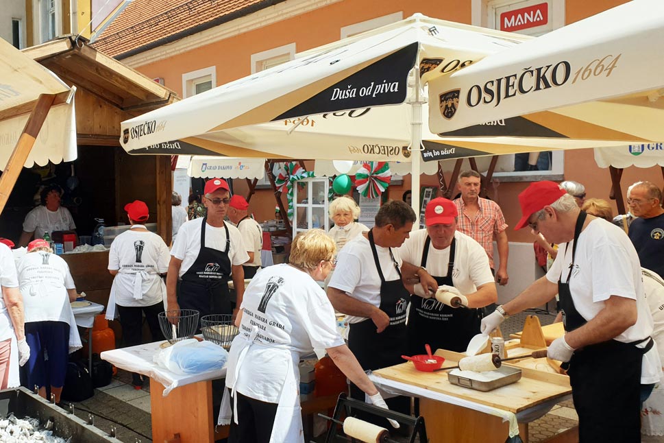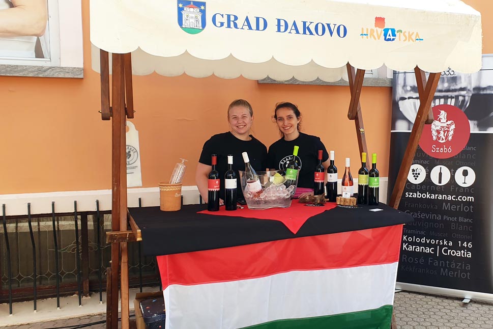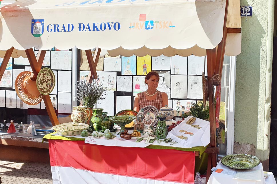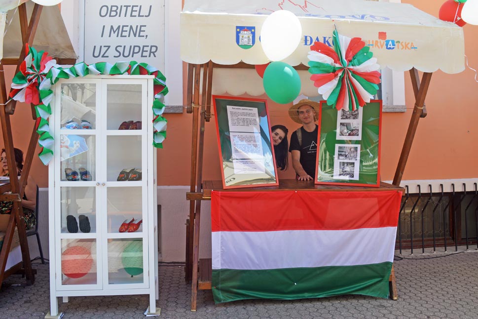Szombat délelőtt Diakovár sétálóutcáján a kávéházi teraszok közötti területeket „benépesítették” a vukovári magyarok, akik gyönyörű hímzéseik kiállítása mellett kürtőskalácsot és lángost is sütöttek. Ott volt a várdaróci Citadella étterem is, amely a đakovói Neven egyesület részére szervezett adománygyűjtést, az ételeket és az édességet pedig jófajta karancsi borokkal lehetett leöblíteni. A pavilonok sorából természetesen az eszéki magyar főkonzulátus standja sem hiányzott.