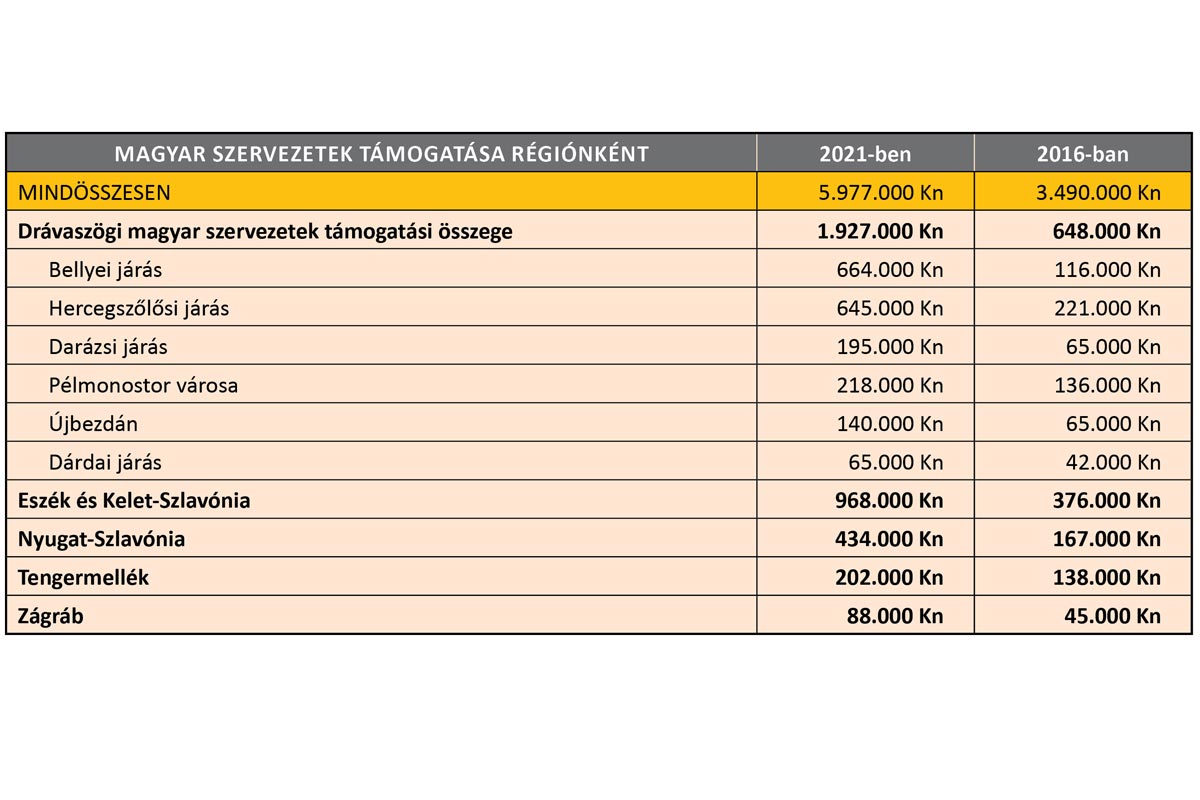 Tehát öt év alatt a horvátországi magyar egyesületek programjainak és működésének a Kisebbségi Tanácson keresztüli támogatása 3.490.000 Kn-ról (2016) az idei 5.977.000 kúnára duzzadt, ami páratlan előrelépés minden hozzánk hasonló nemzeti kisebbséghez viszonyítva is.