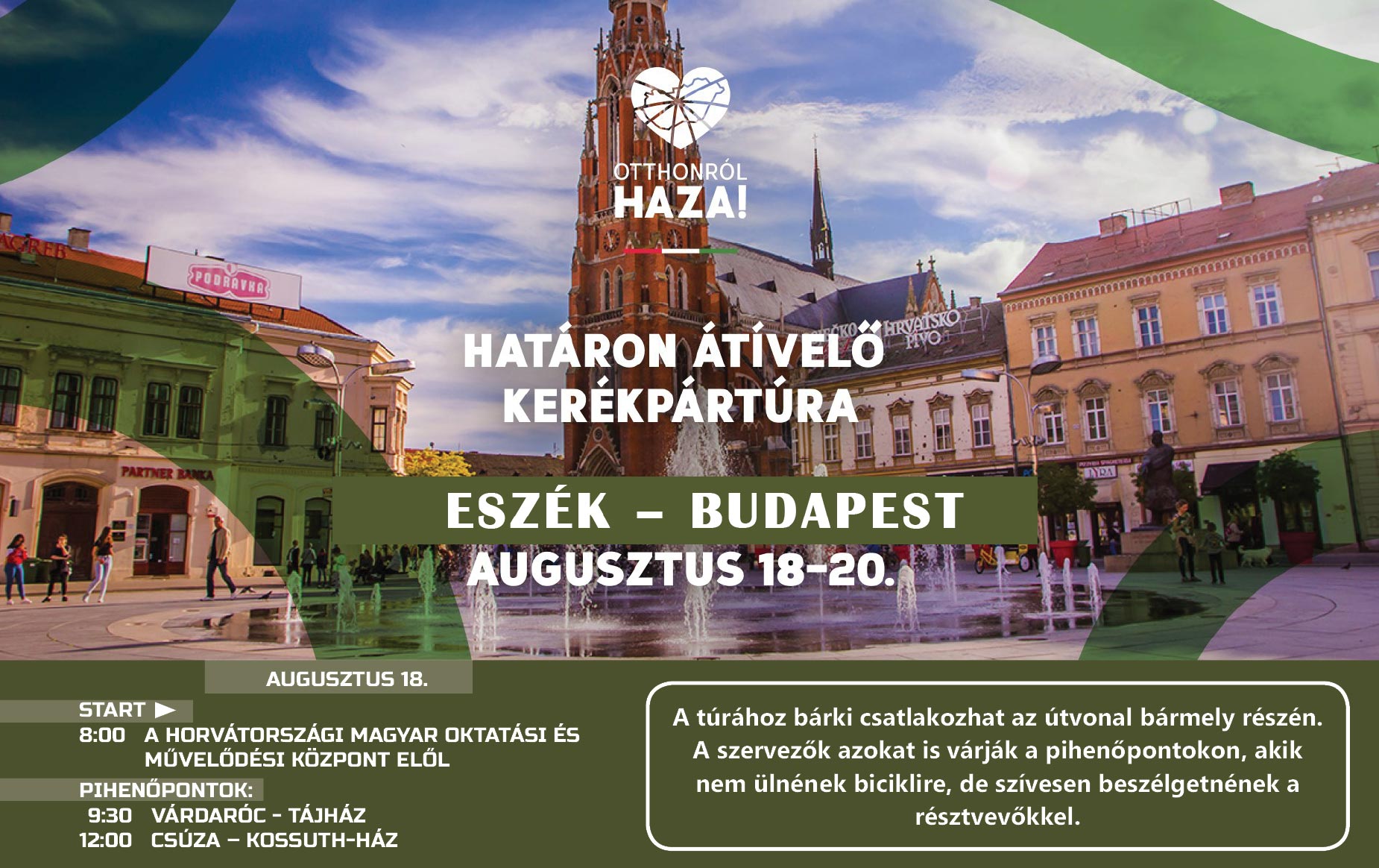 Augusztus 18-án kerékpártúra indul Eszékről Budapestre a nemzeti összetartozás jegyében. A Drávaszögön is áthaladó biciklitúrához szakaszonként is lehet csatlakozni, ezért az is bátran vegyen részt rajta, aki csak néhány kilométert tekerne le.