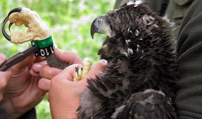 A fiókákat repülésképtelen állapotukban jelölik meg. A szakembereknek ekkor a legegyszerűbb a feladatuk, a madarak szempontjából pedig ekkor a legbiztonságosabb az eljárás. Fészkük 20 méternél is magasabb fákon található. Megközelítésükhöz gyakorlott hegymászóismeretek szükségesek. Ezért a csapat nélkülözhetetlen tagja a budapesti Lukácsi Lóránd, aki ipari alpinistaként dolgozik. Munkahelyén magasépületeket kell megmásznia. Itt pedig fára mászik, a fészekben lapuló madarakat egyenként zsákba helyezi, majd leereszti a földre, ahol a munkatársak megjelölik, és tollmintát vesznek tőle, ami a genetikai vizsgálat alapját képezi. A fészekben található ételmaradékot is megvizsgálják.