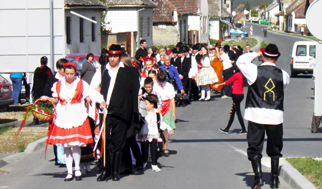 A népi tánccsoportok, énekkarok, tambura- és vonós zenekarok táncolva, zenélve vonultak végig Kiskőszeg főutcáján a falu központjáig, ahol tovább folytatódott a mulatság.
