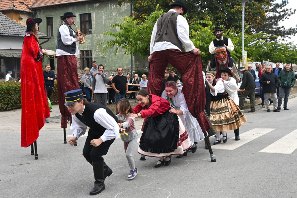 A részt vevő népi tánccsoportok idén is zenei kísérettel – a kórógyi Aranycsárdáséval – vonultak végig a falu főutcáján. A sort vezető bíró és bíróné, akik a helyi táncegyüttes tagjaiként vállalták a szerepet, szőlővel és borral kínálták a nézelődőket. A faluközpontba érve nem maradt el a közös csárdás, s a táncosok látványa mellett a standok gazdagságában is örömüket lelhették a fesztivál résztvevői: bort, szőlőt, szuveníreket, édességeket vásárolhattak, a helyi vadásztársaság pedig bográcsgulyást készített.