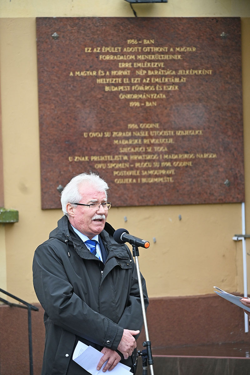Majd az emlékezők a Hermann Paulina-villához vonultak. Ez az épület szolgált a forradalom menekültjeinek ideiglenes szállásul, ezt egy emléktábla is jelzi, melyet Budapest és Eszék önkormányzata állíttatott 1998-ban. Azóta minden évben itt gyűlnek össze a forradalomra emlékezők, hogy leróják tiszteletüket 1956 hősei előtt. A koszorúzás előtt Fuzik János magyar főkonzul szólt a jelenlévőkhöz és elmondta, hogy mindig is csodálta a forradalmárokat, akikre maga is példaképként tekintett. Beszéde után sorra helyezték el koszorúikat az önkormányzatok, a szervezetek, az intézmények képviselői az emléktáblánál.