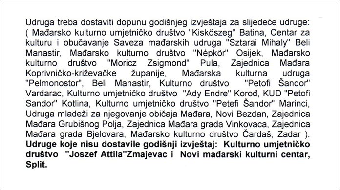 – A 14 MESZ-es egyesület közül, amelyeket az idén támogatásban részesített a Kisebbségi Tanács, 10 feltételesen kapta meg a pénzt, azaz pótbeszámolót kérnek tőlük, mivel náluk is elszámolási problémákat találtak a revíziót végző szakértők: Népkör MKE (Eszék), Pélmonostor MKE, Ójankovci Magyar Hagyományőrző Egyesület, Móricz Zisgmond MKE (Pula), Újbezdáni Ifjúsági Hagyományőrző Egyesület, Grubišno Polje-i Magyarok Közössége, kórógyi Ady Endre MKE, várdaróci Petőfi Sándor MKE, Dárda MKE és a haraszti Dózsa György MKE; amennyiben a pótbeszámolók elfogadhatók lesznek, a felsorolt egyesületek támogatása folytatódni fog, ellenkező esetben megszűnik.